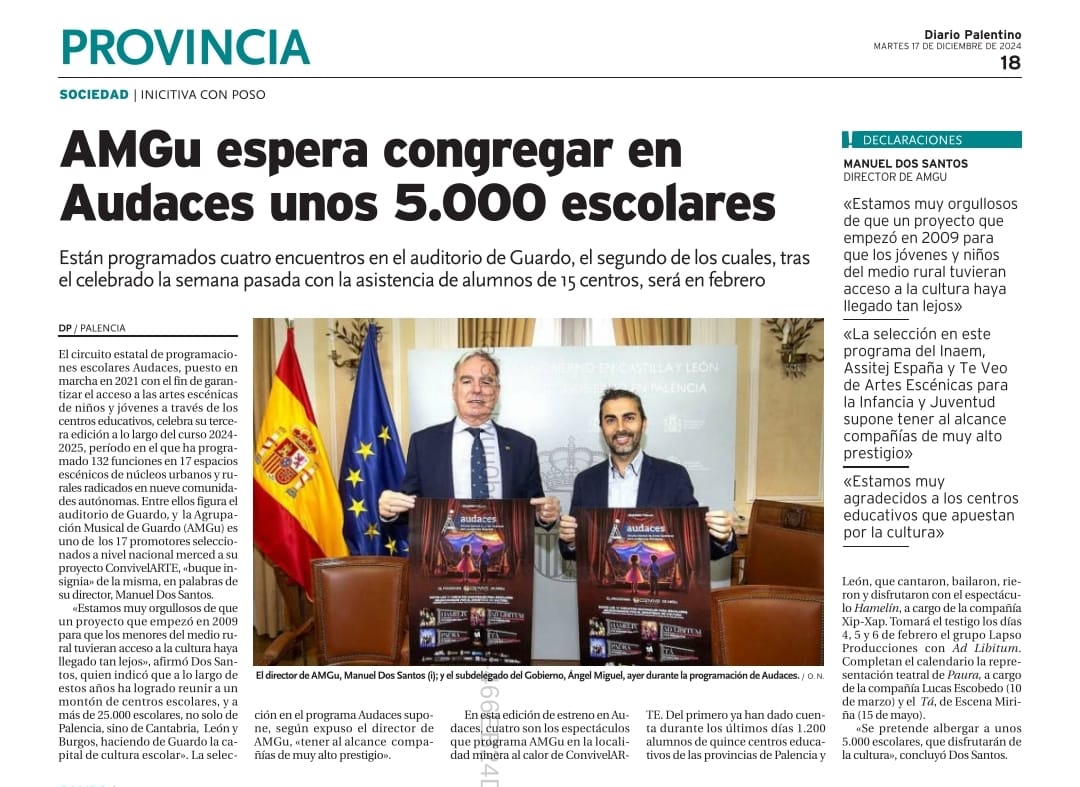 «La Agrupación Musical de Guardo (AMGu) ha sido seleccionada por el Ministerio de Cultura como uno de los 17 proyectos nacionales (el único de la provincia y uno de los cuatro de Castilla y León) que integra el programa Audaces. Se trata de una iniciativa que promueve el Instituto Nacional de las Artes Escénicas y de la Música (Inaem) a lo largo y ancho del territorio en colaboración con Assitej España y Te Veo de Artes Escénicas para la Infancia y la Juventud con el fin de garantizar el acceso a las artes escénicas de los jóvenes.
