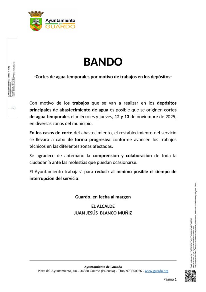 Con motivo de los trabajos que se van a realizar en los depósitos principales de abastecimiento de agua es posible que se originen cortes de agua temporales el miércoles y jueves, 12 y 13 de noviembre de 2025, en diversas zonas del municipio.