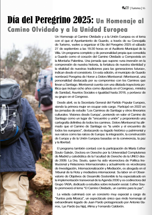 Guardo. [08.09.25] El – El Ayuntamiento de Guardo, a través de su concejalía de Turismo, se complace en anunciar la celebración del Día del Peregrino 2025, una cita anual que tendrá lugar el sábado 27 de septiembre a las 18:30 horas en el Auditorio Municipal de la Villa. Este evento se consagra como un programa completo y de personalidad propia, consolidando a Guardo como el corazón del Camino Olvidado a Compostela en la Montaña Palentina.