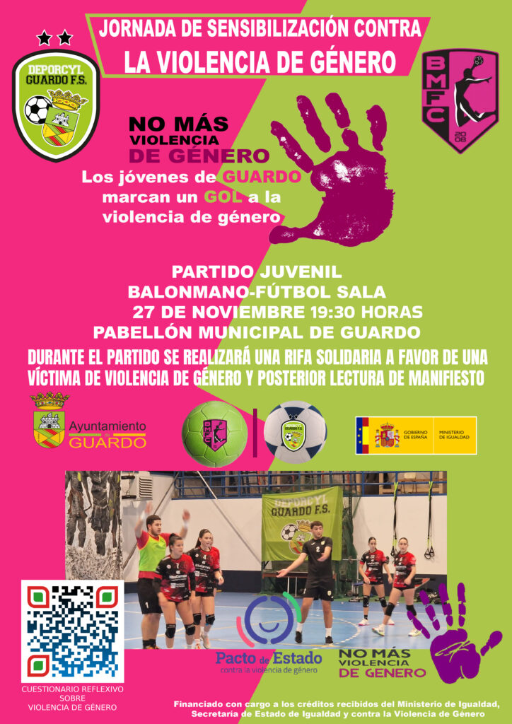 El próximo jueves, 27 de noviembre desde las 7,30 de la tarde, tenemos una cita en contra de la Violencia de Género, todos los guardenses marcaremos un gol a la violencia de género a través de nuestros jóvenes deportistas del Club Balonmano Fuentes Carrionas y el Deporcyl Guardo FS. Una jornada de sensibilización contra esta lacra social con un partido mitad balonmano mitad fútbol sala que jugarán las chicas y chicos del Balonmano Fuentes Carrionas y Deporcyl Guardo FS. Durante el partido se leerá un manifiesto y se realizará una rifa solidaria a favor de una víctima de Violencia de Género.