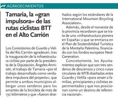 «Tras el éxito de la inauguración del Biciparque Jurásico, que tuvo lugar el pasado jueves, los Ayuntamientos de Guardo y Velilla del Río Carrión han querido trasladar su agradecimiento la Asociación Tamaria-Los Caminos del Monte Vindio por impulsar el proyecto.