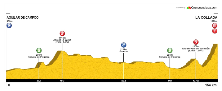 A partir de este punto los deportistas se enfrentarán, después de pasar por Santibáñez y Cervera, a unos últimos 30 últimos kilómetros muy duros. A su paso por Barruelo de Santullán comenzará la subida al puerto del Golobar, en el término municipal de Brañosera, primer Ayuntamiento de España, y finalmente la etapa finalizará tras 10 kilómetros de ascenso continuado en el aparcamiento de la zona de trineos de La Collada.