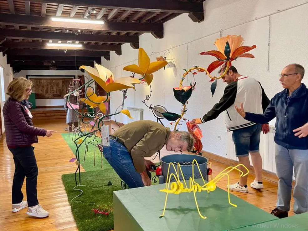 Quienes se acerquen por La Casona darán cuenta de una veintena de trabajos, entre los que e incluye sobre un tapiz de césped artificial un guerrero de terracota, cigüeñas de diferentes estilos, una araña colgada del techo y sus particulares hormigas, que son sello de la casa y no podían faltar en su cita en Saldaña. Completan la muestra un espejo y flores de diferentes formas y tamaños que, además de ser una obra de arte elaborada en forja, funcionan como lámparas ideales para dar un toque distintivo a cualquier estancia. Rematan el recorrido una papelera vacía, con la que se habla de la importancia de no dejar residuos en el campo, y una maleta, que Castrillo invita a llenar de experiencias y buenos recuerdos en las visitas a la naturaleza.